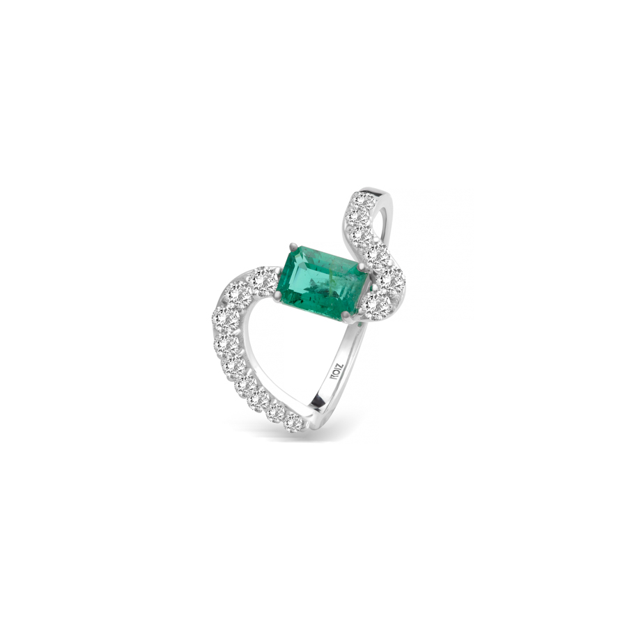 Suas formas suaves, iluminadas por Diamantes cravejados, conduzem o olhar até a Esmeralda central — uma das mais lindas gemas presentes no solo mineiro, onde a natureza revela alguns tons de verde que são desejados no mundo inteiro.