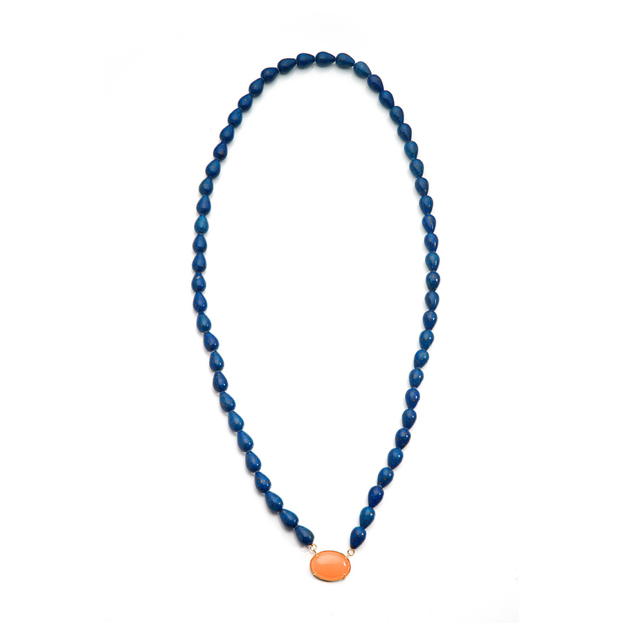 Conhecida por seu azul profundo e suas inclusões douradas, o Lápis Lazuli junto do pingente de Opala laranja traz uma explosão de cor e energia. Os pingentes são removíveis, permitindo que cada cliente personalize seu colar de acordo com estilo e humor.