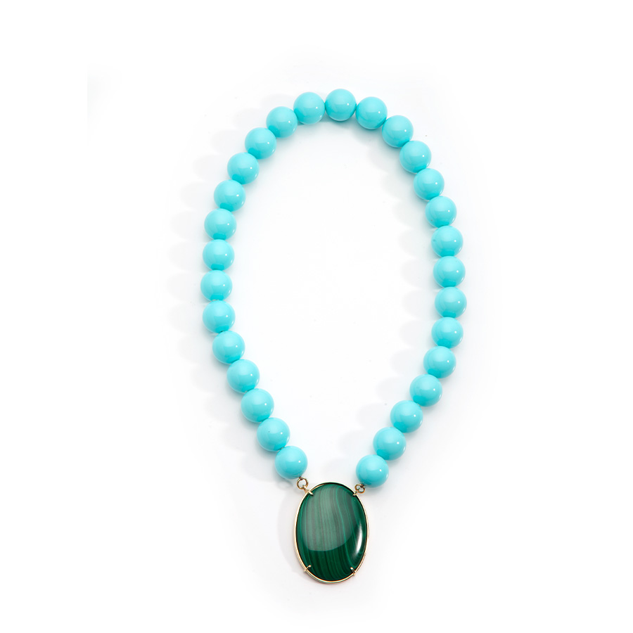 Se encante com o azul marcante da Turquesa em uma combinação única com pingente de Malaquita em ouro amarelo 18k. Os pingentes são removíveis, permitindo que cada cliente personalize seu colar de acordo com estilo e humor.
